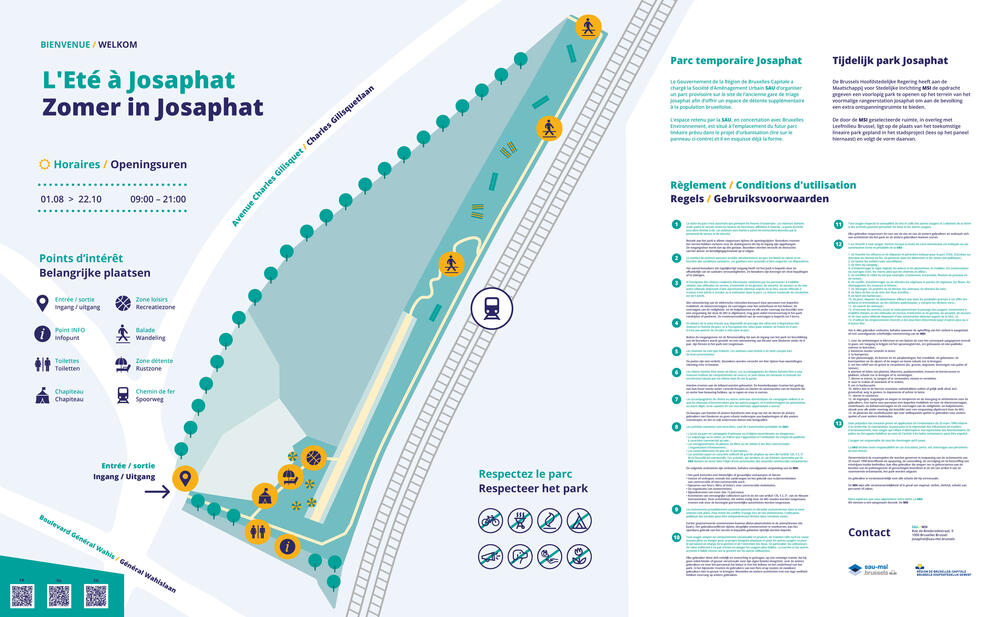 « L’Été à Josaphat », l’occupation temporaire organisée par la Société d’Aménagement Urbain (SAU) à la demande du Gouvernement régional bruxellois, se tiendra du 1er août au 22 octobre 2020 sur une partie de l’ancienne gare de triage Josaphat. Le plan du site avec les détails pratiques (accès, activités, horaire, règlement…) est consultable et téléchargeable ICI.