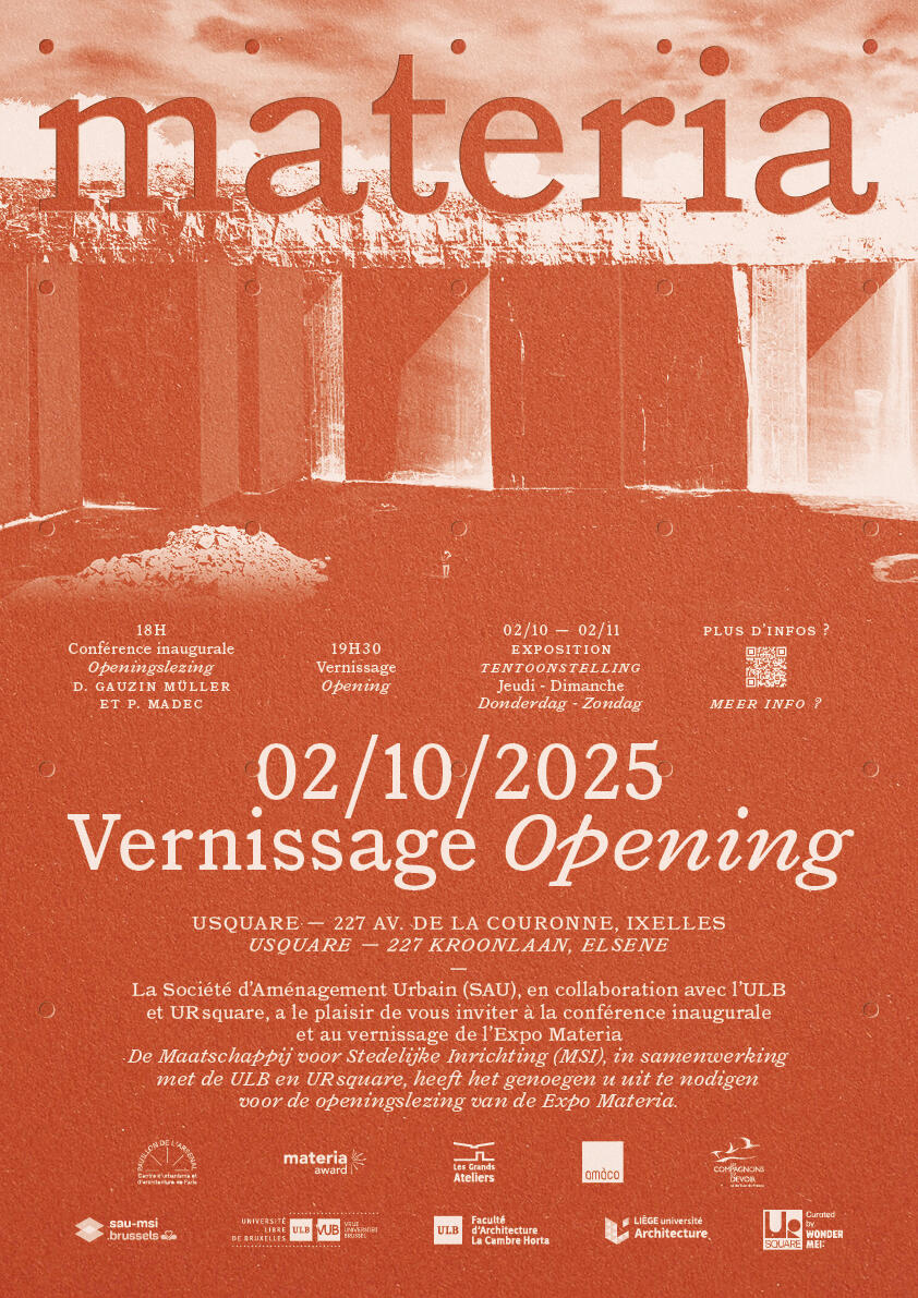 Nous avons l'honneur de vous inviter à la séance inaugurale et au vernissage de l'exposition Materia organisée par la SAU, en collaboration avec l'ULB et UR Square.