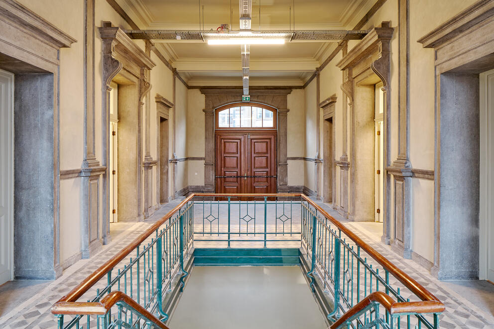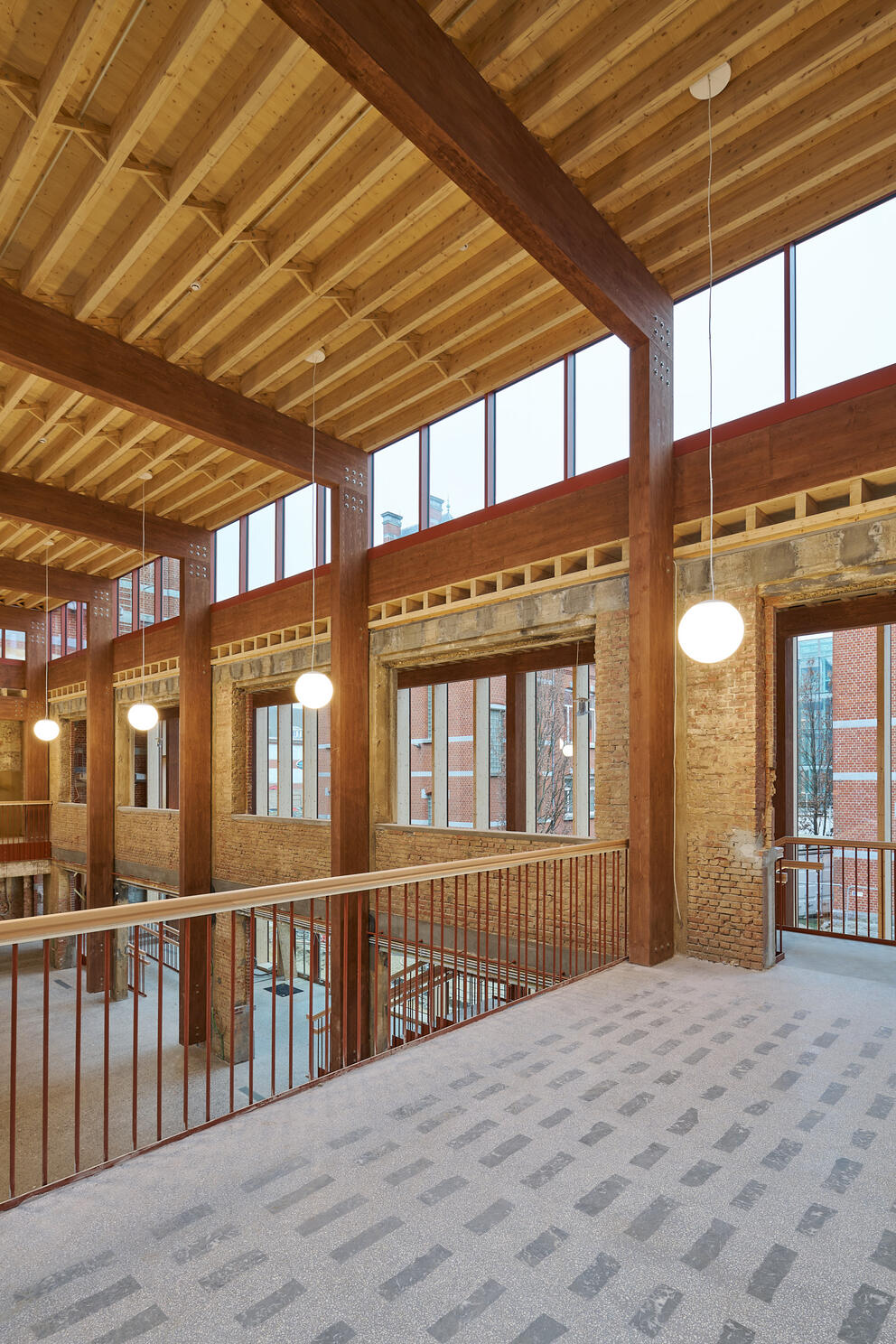 Dans le cadre de la reconversion des bâtiments de la caserne, le principe de l’économie circulaire a été au cœur du projet. L’accent a été mis sur la restauration des bâtiments dans leur état d’origine, tout en tenant compte de leur future utilisation. Les bâtiments n’ont été démolis que lorsque leur stabilité était insuffisante. La conception des nouvelles constructions a été pensée de manière flexible pour pouvoir s’adapter aux besoins changeants. Les possibilités de donner une seconde vie aux matériaux récupérés sur place ont été maximisées. Lorsque cela n’était pas possible, l’utilisation dans d’autres lieux ou le recyclage de haute qualité ont été systématiquement explorés. Cette démarche s’est poursuivie à travers le marché d’éclairage qui a été passé sous forme d’un « Light as a Service » et également pour les acquisitions de mobilier de réemploi ou conçus en upcycling.