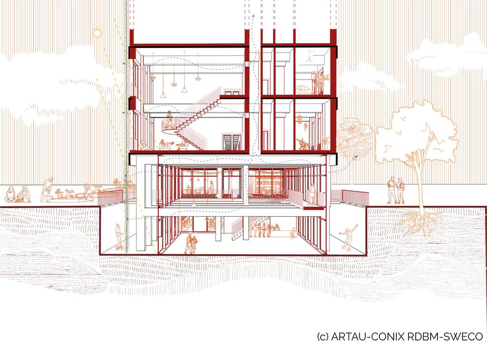 ARTAU – CONIX RDBM – SWECO – ArchiCAZ : « À rebours du mythe de la performance, l’approche se veut frugale et robuste, afin de s’adapter aux fluctuations à venir. Le projet propose de partir du « déjà-là »(matériel et immatériel) et d’amplifier la diversité des appropriations en offrant de nouveaux espaces polyvalents et adaptatifs, permettant ainsi de réinventer de nouveaux usages en extension de l’habitat. Il s’agit d’ouvrir un nouveau chapitre, plutôt que de recommencer une histoire. »