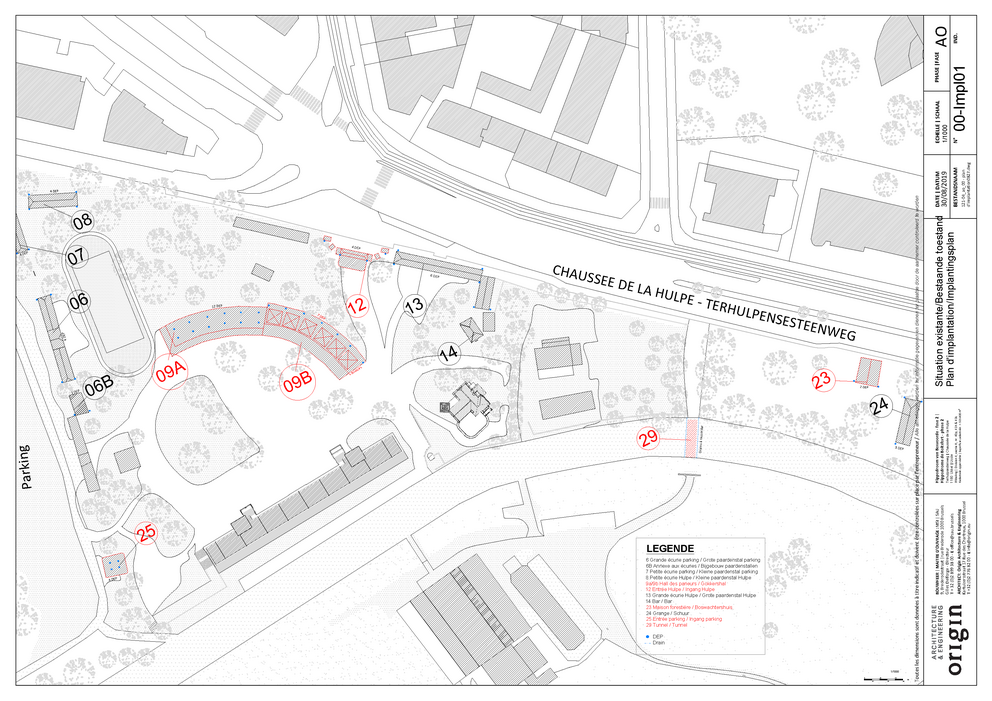 Cette deuxième phase de restaurations casco (gros œuvre fermé) portera sur le hall des parieurs en béton (numéro 9A sur le plan ci-contre), le hall des parieurs en acier (9B), le pavillon de l’entrée principale (12), la maison forestière (23), le pavillon d’entrée côté parking (25) et le tunnel (29).