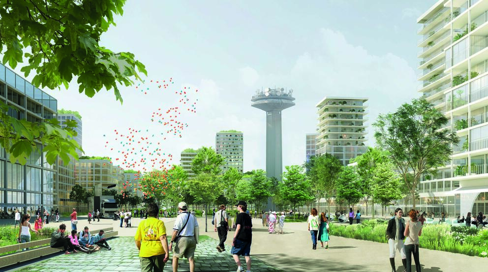 - Aménager un espace vert public – Le plan s’articule autour d’un large espace vert public. Celui-ci se composera d’une partie plus minérale et plantée d’arbres à l’ouest, une partie centrale en terrasses, et une partie boisée, le Bois Georgin, à l’est. Au niveau patrimonial, le plan ambitionne d’activer la tour Reyers, véritable marqueur visuel du site