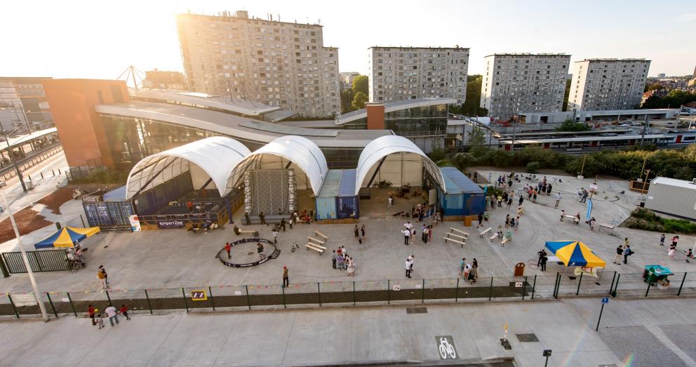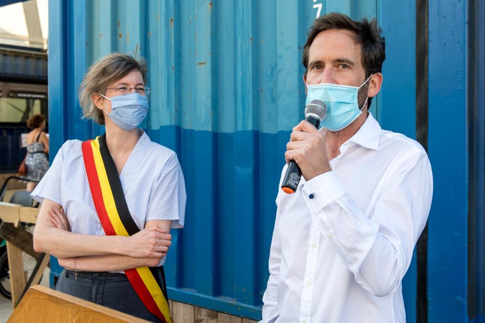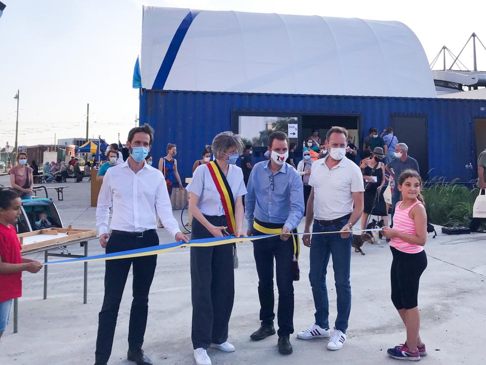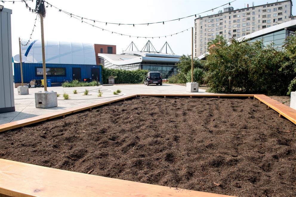- la SAU, dans le cadre de ses missions déléguées par la Région, a organisé un concours d’architecture (remporté par 1010 Architecture & Urbanism) et elle a financé l’équipement du site : installation de six containers (déplaçables et donc réutilisables ailleurs) reliés par un jeu de toitures légères translucides pour abriter les diverses activités et d’une unité supplémentaire pour le concierge désigné par la commune ; aménagement des abords, des plantations et des espaces publics ; adaptation de la clôture ; alimentations en eau, gaz, électricité ; éclairage. La SAU avait obtenu le permis d’urbanisme à la fin janvier 2020 et elle a piloté les travaux d’aménagement du site qui se sont déroulés entre mars et septembre 2020.