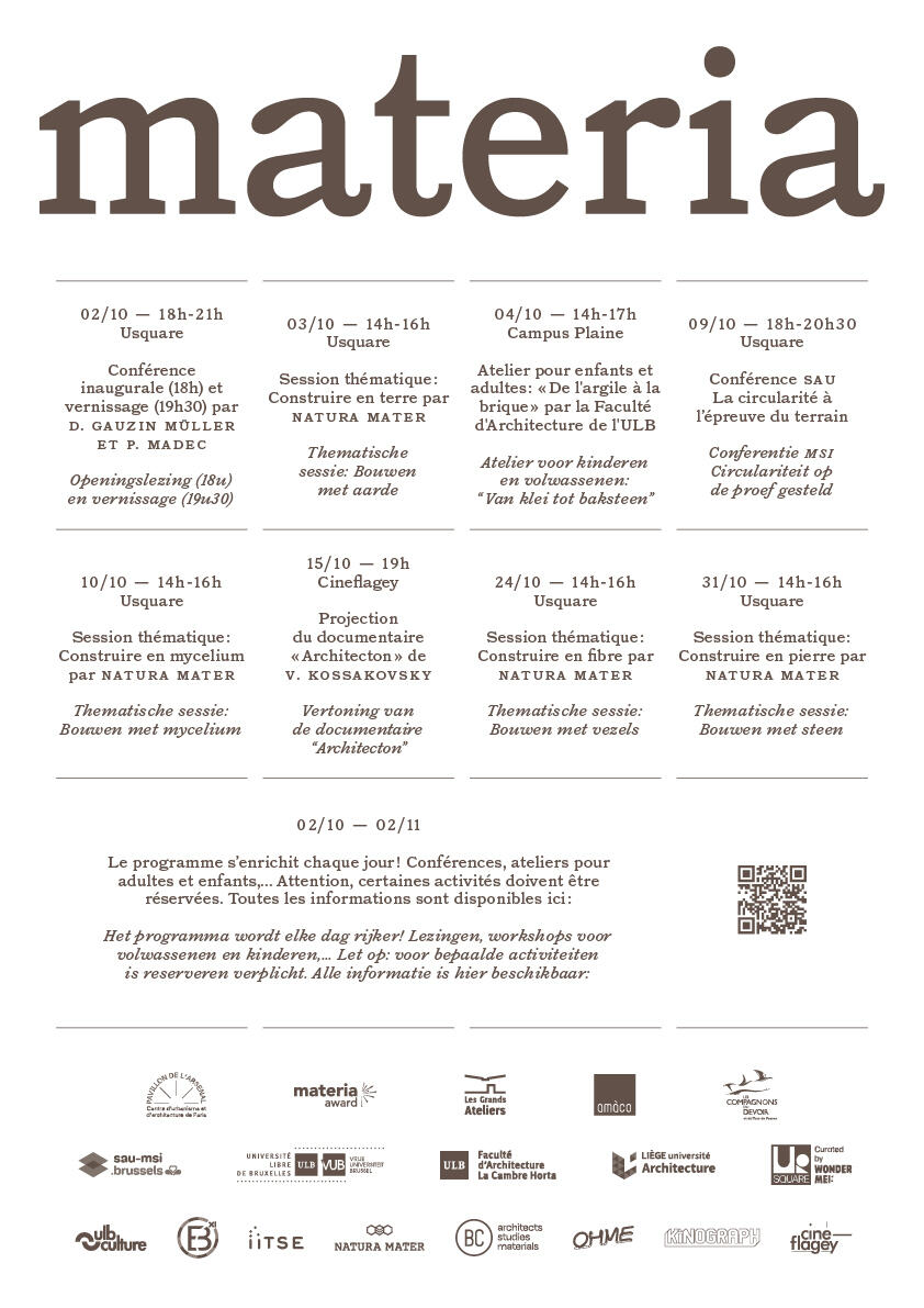 Du 2 octobre au 2 novembre 2025, Bruxelles accueillera l’exposition MATERIA, co-produite par le Pavillon de l’Arsenal, Les Grands Ateliers, amàco et les Compagnons du Devoir, et organisée par la SAU sur le site Usquare. Cette exposition mettra en lumière 40 projets d’écoconstruction, révélant les qualités esthétiques, les performances techniques et les bénéfices environnementaux de matériaux bio- et géosourcés – pierre, terre, fibres – pour imaginer un avenir plus durable.