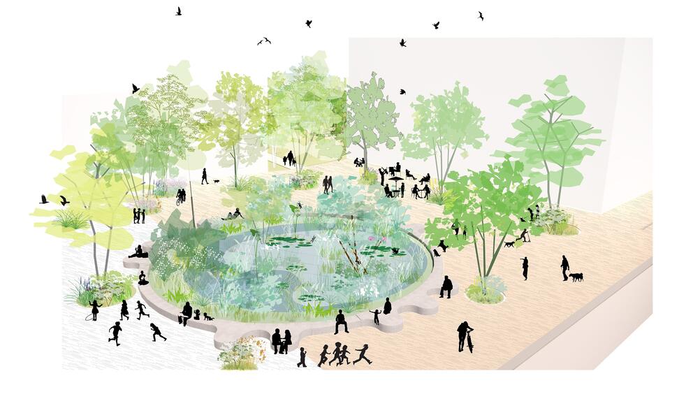• En avril 2023, la procédure de dialogue compétitif aboutit, au départ de 6 propositions différentes soumises à quatre étapes de dialogue et d’évaluation, à l’attribution du marché au Consortium EIFFAGE-AXA. Le projet sélectionné contribue parfaitement à la devise de départ de concilier ville et nature. Il se déploie sur un peu plus de 4 ha et comporte 519 logements répartis au sein de 8 immeubles, le tout niché dans presque 1 ha d’espaces verts publics. Le projet a été retenu pour l’équilibre atteint entre emprise au sol et gabarit qui permet de proposer des espaces publics de qualité, dans lesquels le développement de la biodiversité constitue une préoccupation essentielle. Par exemple 100% des espèces plantées sont des espèces indigènes, y compris des espèces mellifères. La question des ilots de fraicheur est également bien prise en compte grâce à la grande surface de pleine terre, à une gestion des eaux pluviales via la création de mares et milieux humides, à la plantation d’arbres et à l’utilisation d’asphalte claire avec albédo élevé en voirie.