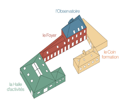 Le projet architectural traduit les missions de la Maison de l’Autisme. Confié en mars 2025 à la coopérative d’architectes KARBON’, il s’organise autour de quatre pôles complémentaires :